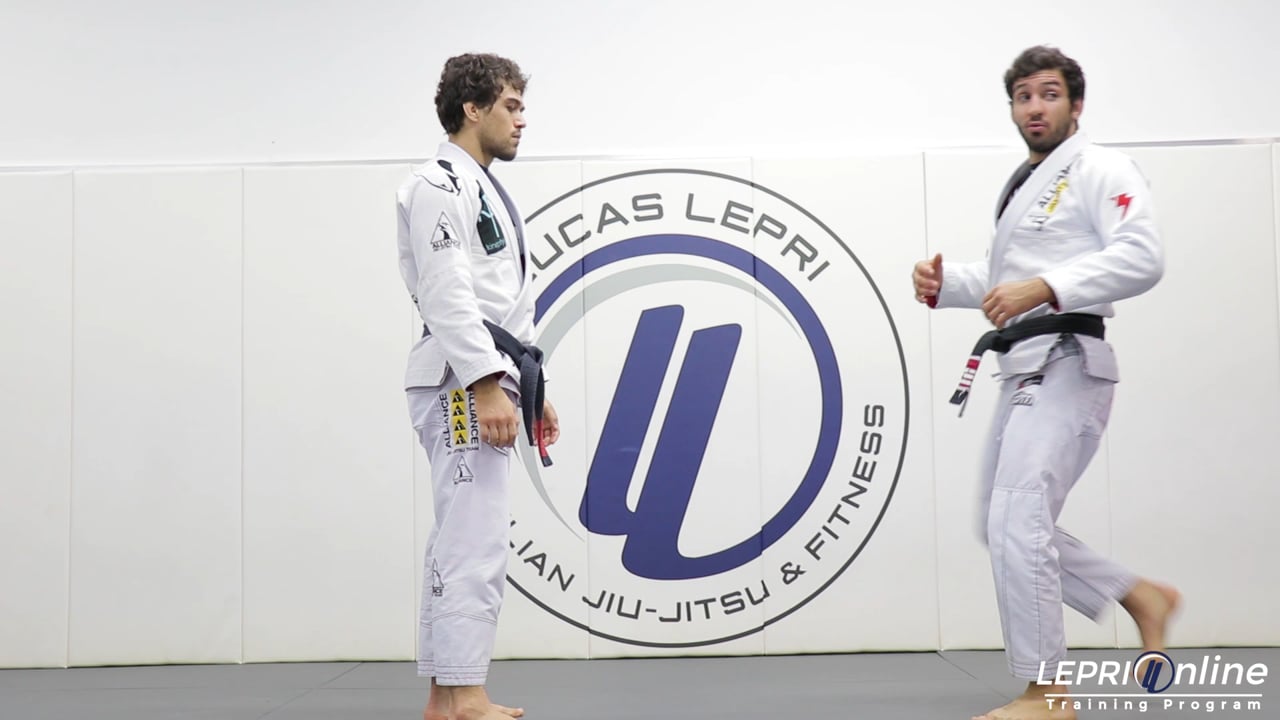 Professor Lucas lepri shows the importance of a proper basing when an opponent pushes you on your chest, back or side while standing. As the opponent pushes Lucas on the chest, Lucas reacts by immediately back stepping with one leg. The stepping back prevents Lucas from falling over. If the opponent pushes Lucas from the back, Lucas steps forward with one leg and immediately turns around and faces the opponent. Same thing when he is pushed from the side, he steps to the side and then faces the opponent.