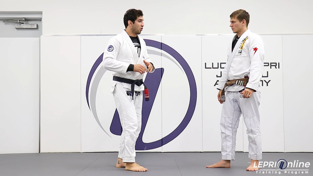 Professor Lucas Lepri shows how to take the opponent down with a hip throw, after escaping from a bear hug. The opponent is facing Lucas and reaches under the arms to hug Lucas. Lucas uses one hand to place it on the hip so he can create enough space to under hook the other side. He then pushes away and steps to the side. Lucas throws the opponent and when the opponent hits the mat, the opponent immediately tries to recompose the guard and places both of his feet on Lucas’ hips.
