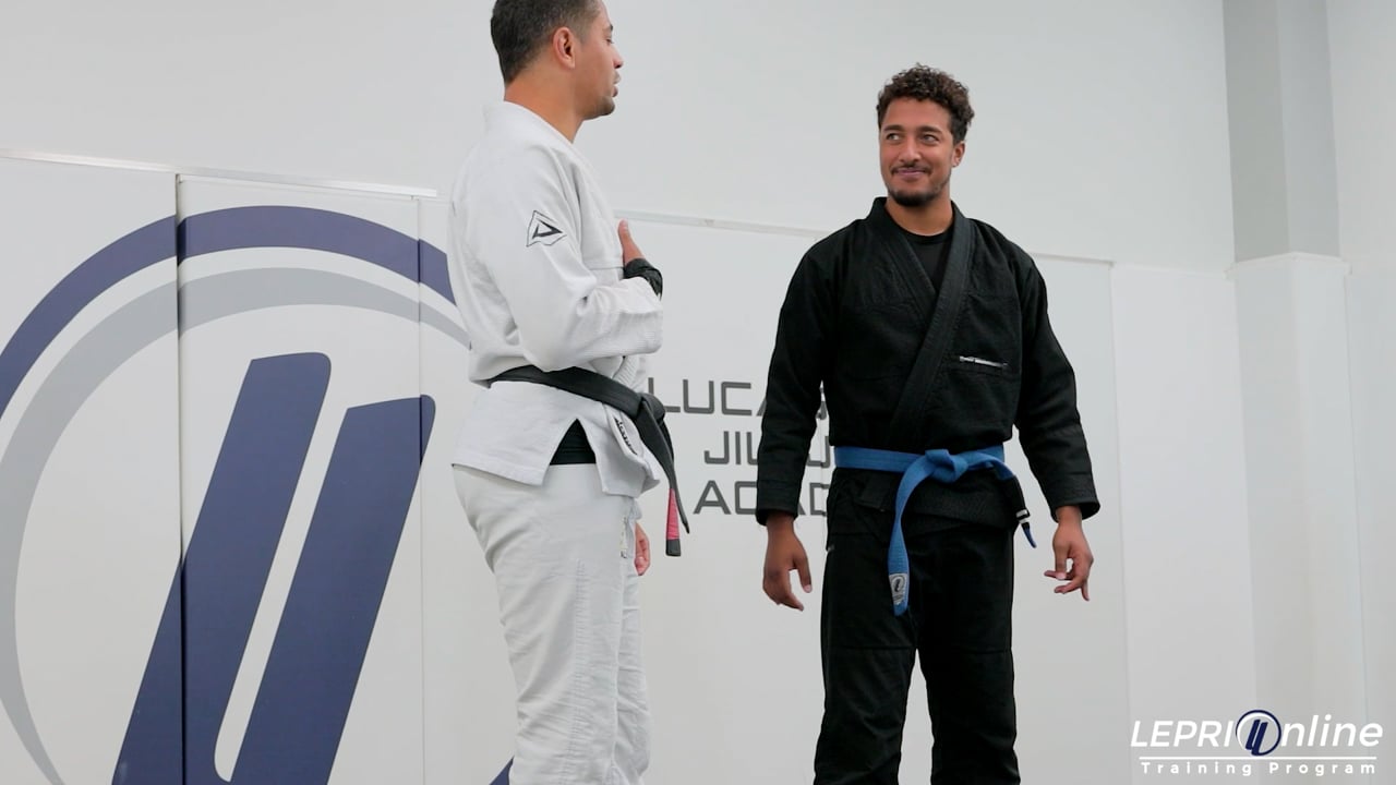 Professor André Gois talks about and teaches how to break a basic collar grip. The opponent moves in and grips André’s collar. André uses his outside hand to grip the opponent’s sleeve. The other hand is used to grip the wrist. André now leans back as he pushes the arm away, making the opponent break the grip.