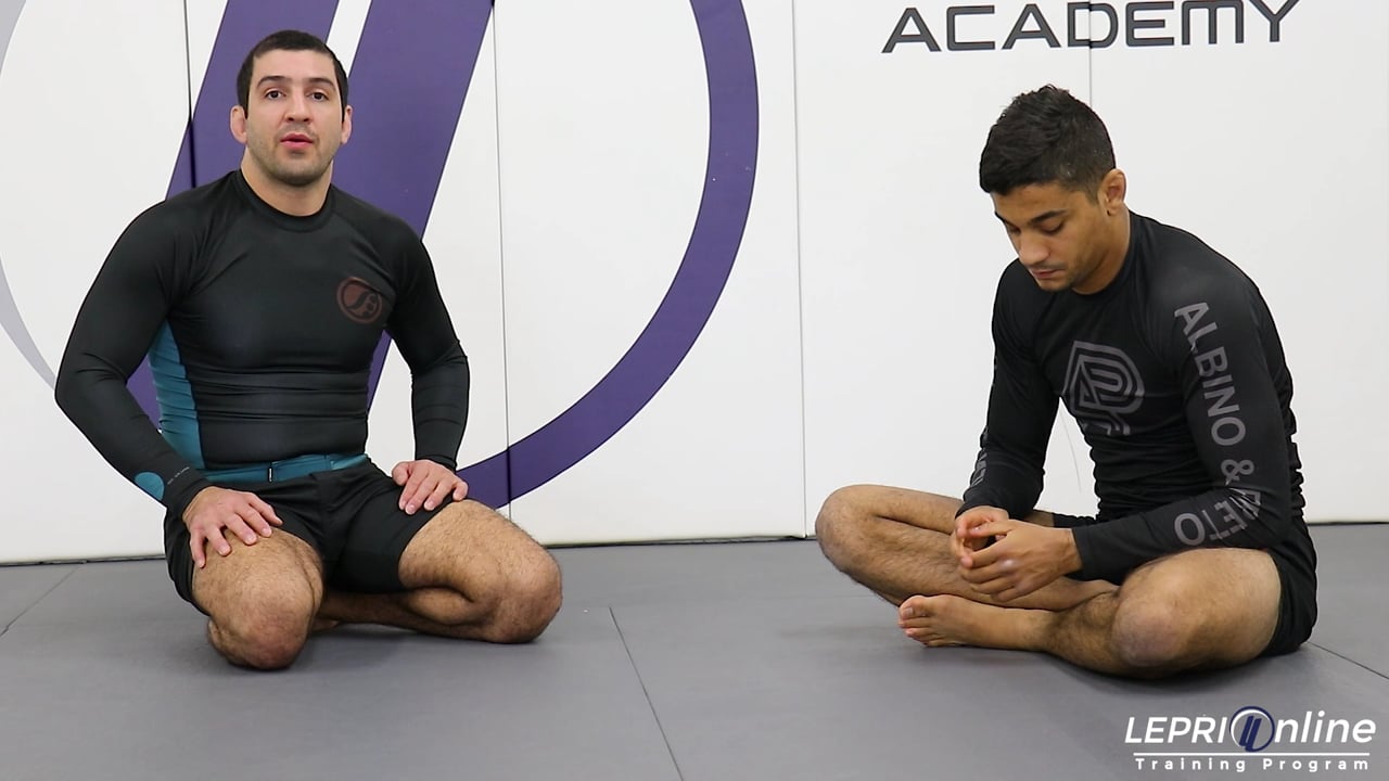 Professor Lucas Lepri teaches how to get an arm triangle or one arm guillotine, after escaping from the opponent using the butterfly guard to attack. The opponent has the butterfly guard on Lucas and starts to elevate him. Lucas maintains his balance. He starts to escape by lowering one knee and immediately circles that leg out. He drops his knee over the opponent’s leg and places it on the mat. In this scenario, the opponent has the neck exposed. So Lucas immediately slides his arm over the head and cups the chin. He falls forward and gets the arm triangle. If he is not able to get the arm triangle, then he rolls back and finishes with the one arm guillotine.