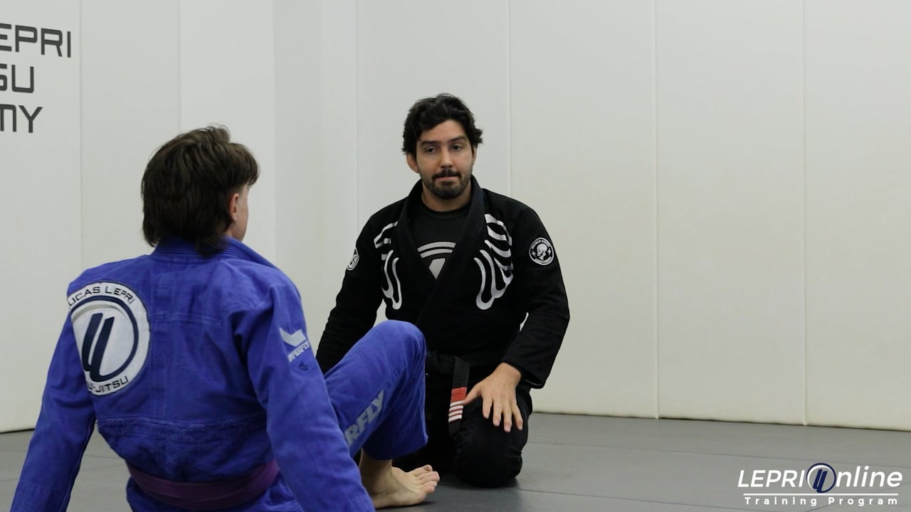 Professor Lucas Lepri teaches how to counter a butterfly sweep attempt by using the knee cut. The opponent has the butterfly guard and is controlling Lucas. He pulls Lucas in in an attempt to sweep. Lucas counters by leaning to the opposite side of the arm the opponent is controlling. As he leans to the side, he brings his knee in for a knee cut. Lucas is able to pass and get the side control position, or the mount control.