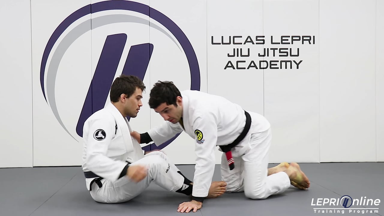 Professor Lucas Lepri shows how to get to the opponent’s side control when the opponent attempts a sweep from the butterfly guard. As soon as the opponent sits up, Lucas immediately turn his knee in and leans to the same side the opponent is gripping the belt. Lucas then reaches with one hand and grips the opponent’ leg and reaches for the back with the other. He starts falling to the side and uses the grip on the pants to push the opponent. Lucas keeps moving to the side and then establishes the side control.