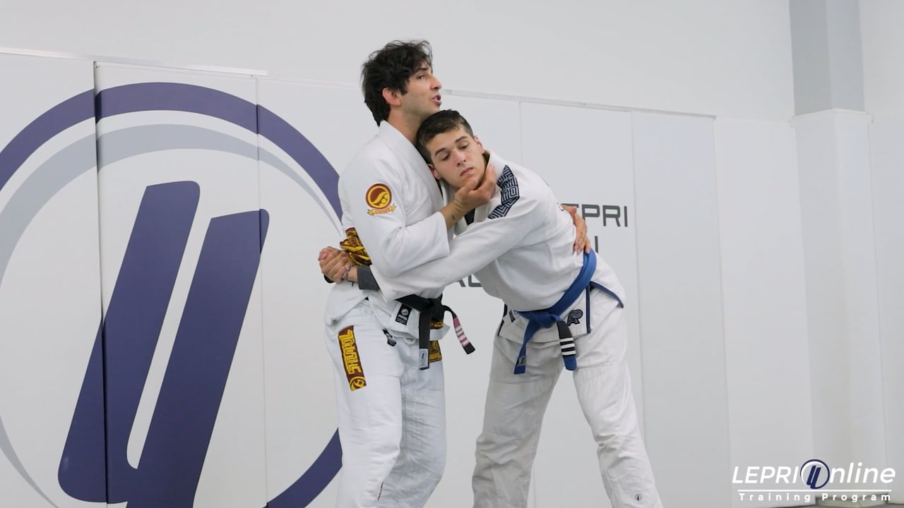 Professor Lucas Lepri shows how to escape from a clinch and also talks about clinch concepts. He shows how to use pressure on the chin to move the opponent away and takes the opponent down by tripping them back. As the opponent falls, Lucas shows how to transition to the mount and also shows how to maintain the mount control.