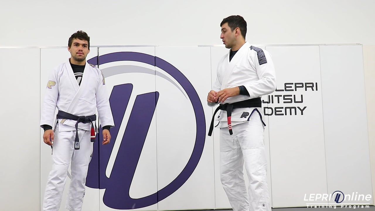 Professor Lucas Lepri shows how to get the clock choke, when the opponent goes for a single or double leg takedown. The opponent shoots for the legs in an attempt to get the single leg or double leg takedown. Lucas immediately defends by sprawling back and blocking the shoulder with his arm. Once on the mat, Lucas turns to the side and slides his near side arm under the neck to grip the opposite side collar. The other hand can be used to control the opponent’s other arm or the other collar. From here, Lucas applies chest pressure and starts to walk to the side to finish the clock choke.