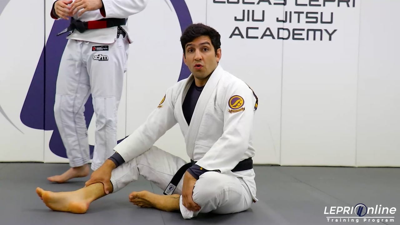 Professor Lucas Lepri shows how to get the armbar from the closed guard, by uner hooking the leg. Lucas has the opponent in the closed guard and controls both sleeves. He picks a side and under hooks that leg while still controlling the other sleeve. Lucas now opens his guard so he can pendulum his legs and shifts his hips to the side. From here, he brings his outside leg over the opponent's head and gets the armbar submission.