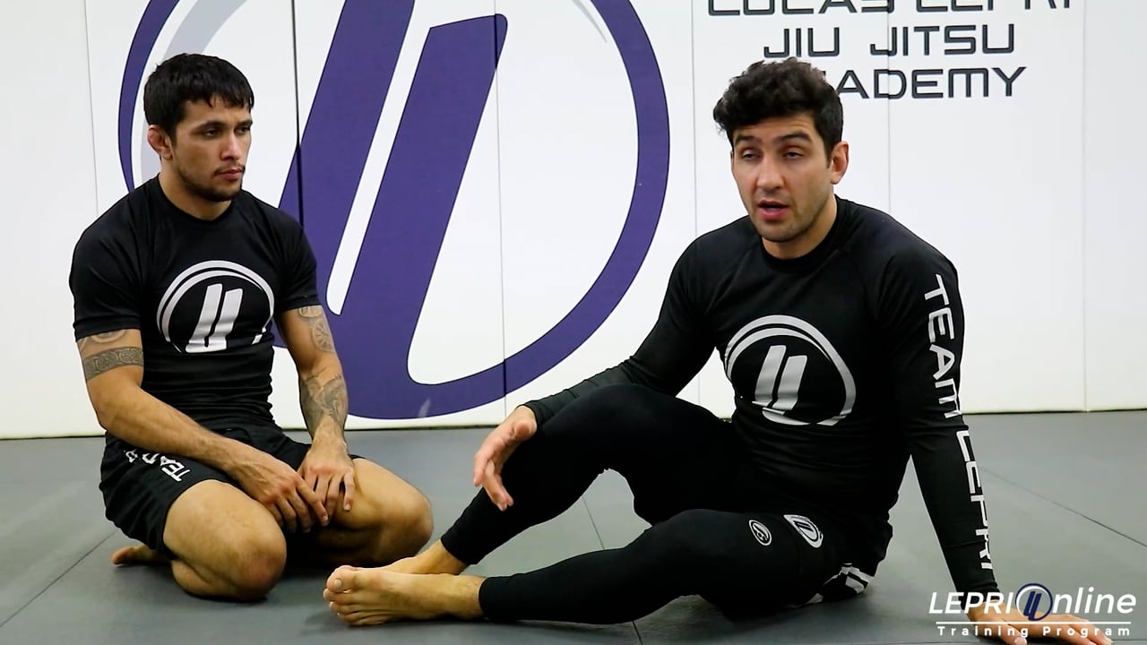 Professor Lucas Lepri shows how to take the back control, after attempting an armbar or sweep from the closed guard. Lucas has the opponent in his closed guard. The opponent has good posture and Lucas isn't able to break the opponent down. Lucas instead grips one of the arms and pulls it across, locking it under his own armpit. This allows Lucas to reach over the shoulder with his other hand and also allows him to raise his legs. In this scenario, Lucas is not able to get the armbar or sweep. Lucas instead pendulums his legs and comes up on his elbow. He then reaches for the back with his hand and pulls himself up. He shifts his hips and gets the back control. Lucas and also lock the body triangle from here.
