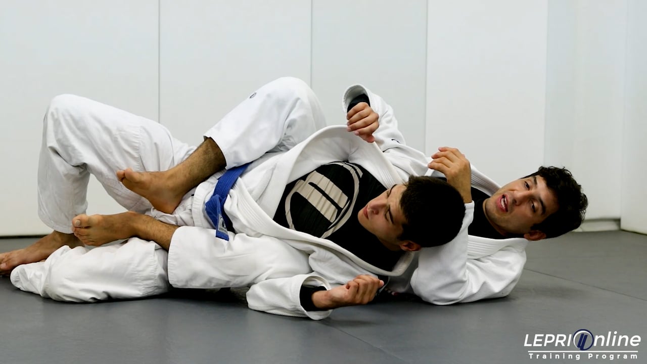 Professor Lucas Lepri teaches how to take the back control from the closed guard. Lucas starts with the opponent in his closed guard. He grips one of the opponent’s sleeve over the top with both hands. He pushes the arm up to break the grip on the collar. Lucas now circles the opponent’s arm under both his own arms. He releases one grip and uses his free hand to grip the same side arm behind the elbow. Lucas now pushes the arm across. The grip from behind the elbow is now released and Lucas reaches over the opponent’s back to grip the other side near the armpit. He now open’s his guard and hip escapes to adjust. In this variation, the opponent bases out with his leg preventing Lucas from pulling him back to take the back. Lucas comes up on this bottom elbow and unlocks his legs. He puts one leg in between the opponents and starts to move his hip onto the opponent’s back. Once he is up, he slides his other hook in and hooks the back of the opponent’s leg. From here, Lucas is able to pull the opponent back and finishes taking the back control.