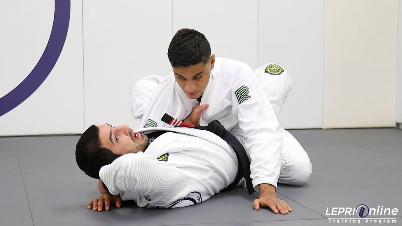Professor Lucas Lepri teaches how to get the cross collar choke after breaking the opponent’s grip and isolating the arm. Lucas has the closed guard and reaches for the opposite side sleeve. He grips the top of it and slides his other hand under the arm to grip his own wrist. This allows Lucas to break the opponent’s grip. Lucas then brings the arm up and uses his other arm to trap the arm. He then slides his hand under the arm to grip the opposite side collar. from here, Lucas now grips the other collar with his opposite side hand and finishes the cross collar choke.