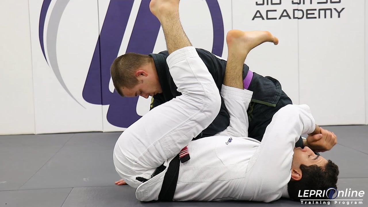 Professor Lucas Lepri attempts an omoplata from the closed guard, but the opponent defends and he goes for the leg drag instead. Lucas controls the opposite sleeve and under hooks the same side leg to go for the omoplata. The opponent defends by turning the elbow out. Lucas immediately grips his hands together while still controlling the leg. He then brings his other leg over the opponent’s and grips the back of the pants. The opponent tries to stand up and Lucas hips escapes and hooks the leg to force the opponent back. In this scenario, the opponent starts to put his back on the mat to try and escape. Lucas gives up on taking the back and immediately goes for the leg drag.