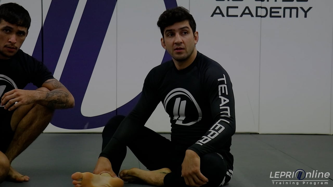 Professor Lucas Lepri teaches how to get the triangle submission from the closed guard, by breaking the opponent’s posture down and using their reaction. Lucas has the opponent in his closed guard. He controls the opponent’s head to break the posture. When the opponent pushes to move away, Lucas immediately comes up with him and uses his arm to bump him to the side. This makes the opponent post with his hand on the mat. Lucas takes advantage of the arm and slides his leg out and over to get the triangle submission.
