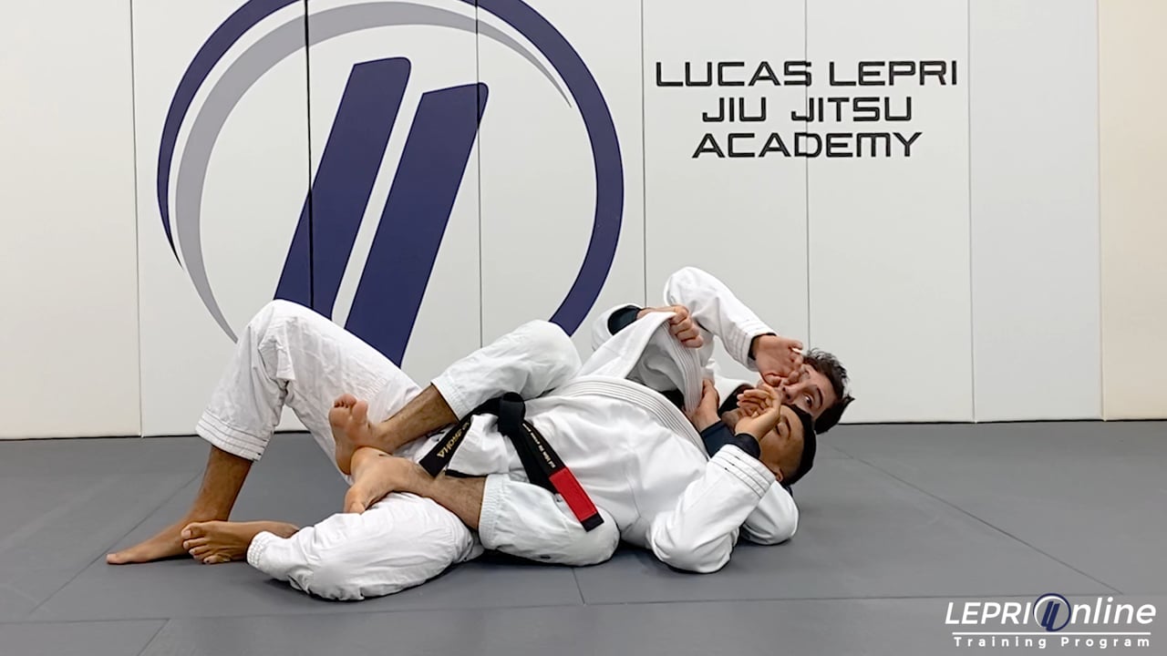 Professor Lucas Lepri teaches how to finish the back take with a collar choke. Lucas has the opponent’s back with the seat belt grips and both hooks in. He pulls the collar up so he can feed it to his other hand. Lucas then slides his hand up to the opponent’s neck. The hand that fed the collar is now placed behind the opponent’s head. Both arms are now extended to get the collar choke.