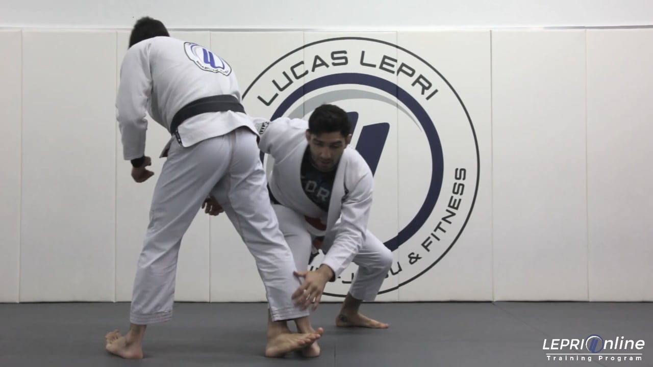 Professor Lucas Lepri teaches the collar drag ankle pick takedown. Lucas begins with a cross collar grip and a grip on the opponent's wrist or sleeve. He drags the collar to the side slightly while switching his base to step behind the opponent's heel and then immediately holds behind the opponent's ankle and lifts. From this position Lucas has the option to block outside of the opponent's ankle with his foot and circle him down to the mat. He can also step laterally and block behind the opponent's leg with his own leg, completing the takedown and being careful to prevent the opponent from applying the armbar as he sets up his pass.