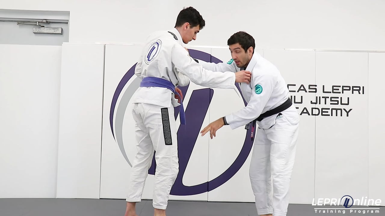Professor Lucas Lepri shows a collar drag to a single leg entry drill. Lucas and the opponent are both standing and Lucas immediately reaches for the opposite collar and same side sleeve. Lucas then steps to the side and collar drags the opponent. He grabs the leg and goes for the single leg entry. From there, Lucas stands up and then repeats the drill.