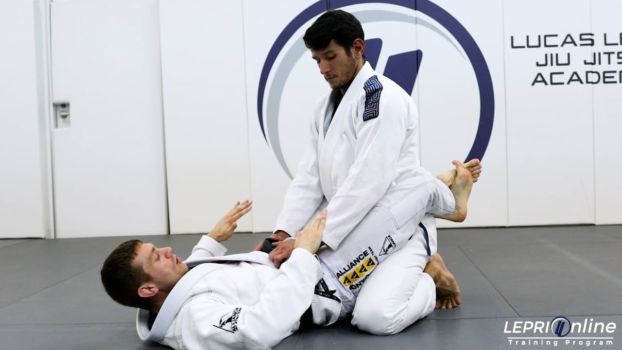 Professor Donovan Espinosa teaches how to get the cross collar choke from the closed guard. Donovan has the closed guard on the opponent and the opponent is posturing up by placing their hand on the chest. Donovan starts to break the opponent down by swimming his hands under the arm as he pulls the opponent in with his legs. With the opponent now closer, Donovan opens the lapel with the same side hand so he can feed his other hand to it. He now crosses the other hand under his own arm to grip the opposite side lapel. Donovan now finishes the choke by curling his wrists in and uses his legs to keep the opponent from posturing up.