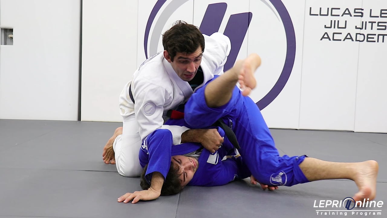 Professor Lucas Lepri shows how to get to the back after passing using the double under. The opponent has the De La Riva and Lucas defends by pushing down on both legs. Depending on the opponent’s reaction, Lucas reaches under and over one leg to grip the opposite collar. Lucas’ other hand is still controlling the leg. As he pushes the opponent forward, Lucas then switches the leg grip to the back of the pants. The opponent starts to roll and Lucas keeps his hips next to the opponent. The opponent tries to roll once again and then Lucas takes the opponent’s back.