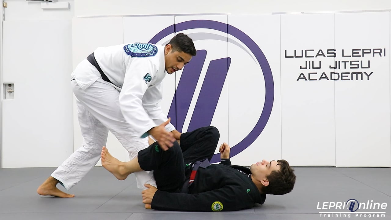 Professor Andre Gois teaches a drill on how to remove the opponent's de la riva hooks and go for a leg drag. The opponent starts with the De La Riva and Andre first breaks the collar grip. He then places both hands on the opponent's legs so he can push them down as he steps back. Andre then turns the ankle in, so he can drag the opponent’ leg to the side over his own leg.