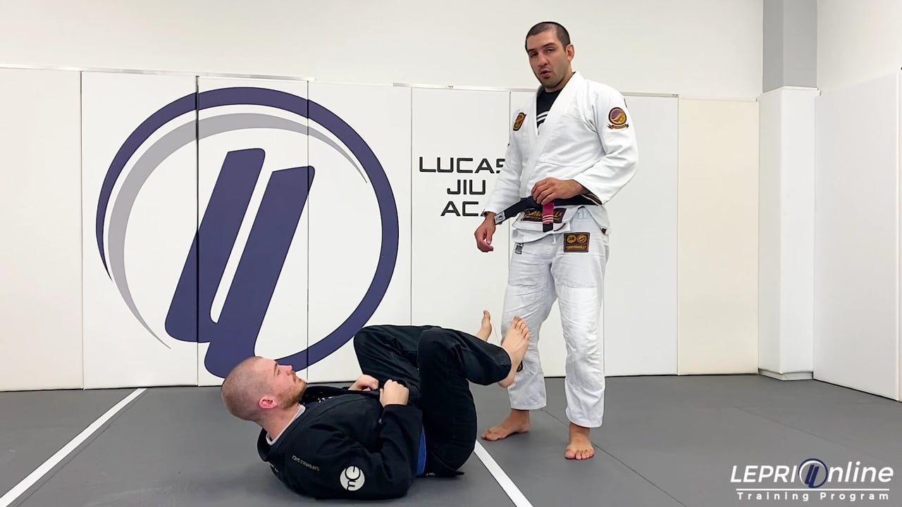 Professor Lucas Lepri teaches how to pass the de la riva when the opponent tries to defend by circling his leg up. Lucas goes for the pants control by gripping below the knees. As he pushes both legs down and steps back, the opponent tries to recompose circling his leg around. Lucas immediately reacts by pushing the leg out and slides his other hand over the same leg near the hip. He now dives under the leg and lays his body perpendicular to the opponent’s. Lucas finishes the pass by coming up to his knee and reaches with his outside hand to the cross collar. From here, Lucas passes to the side control.