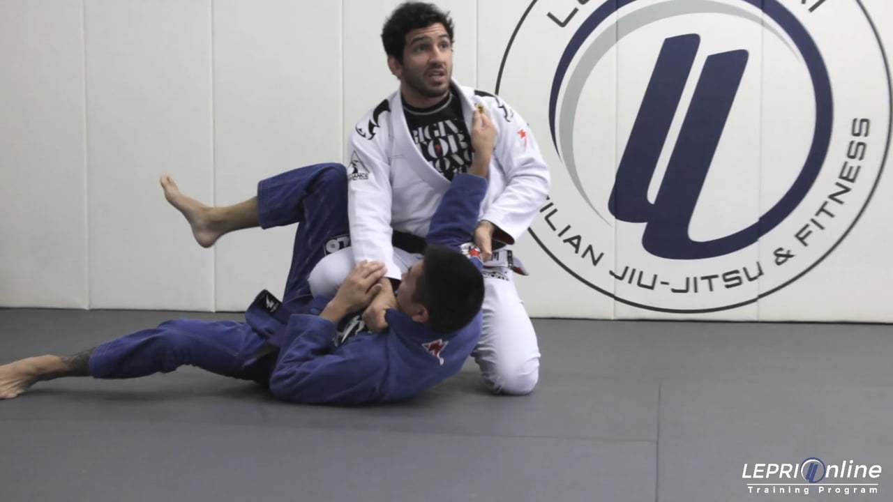 Professor Lucas Lepri demonstrates a De La Riva guard pull and steering wheel sweep. Lucas begins standing with grips on the opponent's lapel and sleeve beside the elbow. He steps to the side of the elbow grip and sits while applying the De La Riva hook. Lucas pulls the opponent forward and rotates his arms as if he were turning a steering wheel, using momentum from the guard pull to sweep his opponent.