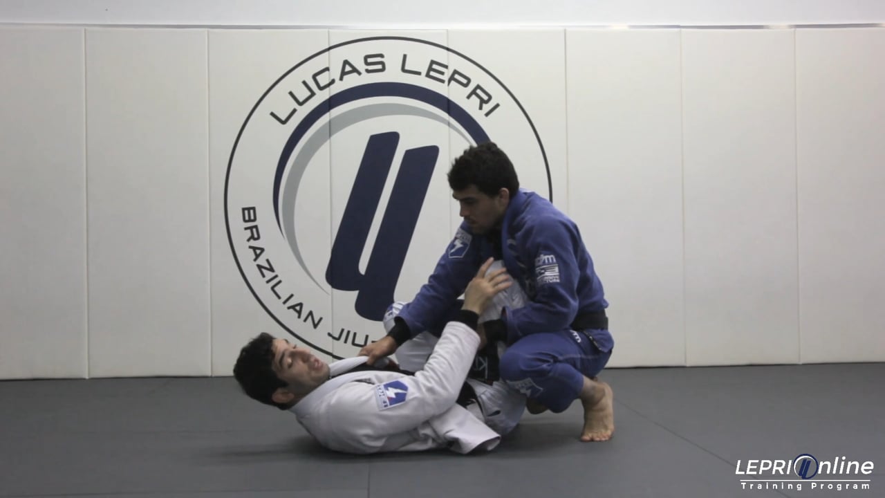 Professor Lucas Lepri demonstrates a sweep from De La Riva guard when an opponent defends against his initial sweep attempt by shifting his weight backward. In this situation, Lucas uses his leg and his collar grip to topple the opponent to the side. Lucas then posts on his elbow and keeps the opponent on the mat by maintaining his grip on the pant leg and pushing with the collar grip. Once he is able to circle his leg to the inside, he finishes the sweep using a technical stand up.