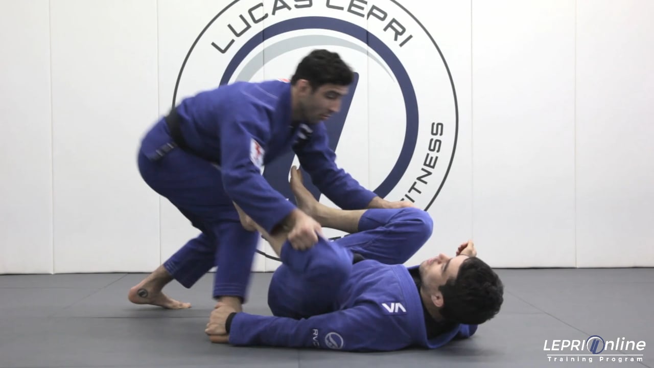 Professor Lucas Lepri explains how to pass De La Riva guard using a leg drag when the opponent resists his initial leg drag attempt. The situation begins with Lucas in the opponent's De La Riva guard with an ankle grip and a cross-collar grip. The first thing Lucas does is break the lapel grip by pushing his lead knee forward, posturing up, and using both hands to push the opponent's hand away. Once the cross-collar grip is broken, Lucas disengages the opponent's legs by gripping both pant legs with fingers pointed out, pushing down, then pushing forward. He applies pressure using his lead leg, but when he releases the pressure to drag his opponent's legs to the side he is not able to drag them far enough. The opponent responds by resisting the leg drag and driving his legs back to prevent the pass. Lucas emphasizes the importance of timing and momentum; as the opponent drives his legs back toward Lucas, Lucas pushes the legs in the same direction as the opponent is moving them, taking advantage of the momentum to clear the legs. Lucas is then able to grab far collar, lock his elbow to his knee, and release the collar and slide into side control when the opponent attempts to turn and face him.