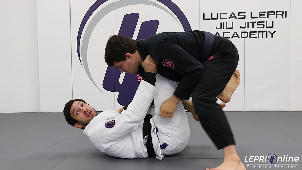 Professor Lucas Lepri shows a De La Riva sweep that ends with the knee cut pass when the opponent reacts. Lucas has the De La Riva and tries to push the opponent to one side. The opponent reacts by coming back. Lucas takes advantage of this and sweeps the opponent in the direction he reacted. He comes on top and starts working the knee cut pass.