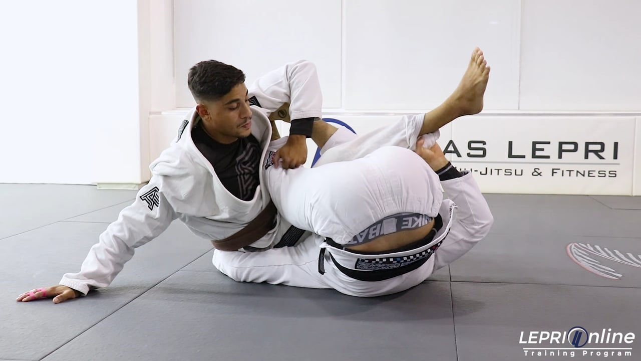 Professor Lucas Lepri shows how to get the back from a series of attempts when the opponent reacts. Lucas starts with the de la riva guard. He pushes the opponent to the opposite side he has the pants grip by collar dragging him and pushing on the hip with his unhooked foot. The opponent reacts by trying to come back to face Lucas. Lucas takes advantage of this to sweep the opponent in the other direction. When the opponent hits the mat, Lucas inverts himself by pulling on the collar. Once inverted, he crosses his feet together and releases the collar grip so he can then grip around the opponent’s hip. The leg that was on top is brought under the shin, trapping the opponent’s leg. Lucas releases the grip on the de la riva grip and grips the other leg instead. As he grips the leg, Lucas brings his other leg under the shin and uses his other leg to post on the mat as the comes on top dragging the leg. Lucas then moves to the other side and gets the side control. The opponent tries to escape by turning away. Lucas then slides one knee in and brings his other foot over the opponent’s leg. He then uses the top leg to twist the opponent, making him give Lucas his back. Lucas then puts his hooks in and takes the back.