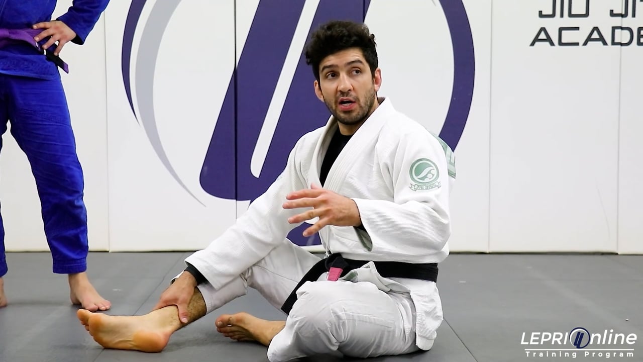 Professor Lucas Lepri teaches how to sweep the opponent, starting from the de la riva using a modified x guard. Lucas has the de la riva and the opponent pushes the top leg down. Lucas immediately locks his feet together behind the leg and uses them to push the opponent forward to unbalance. With the opponent posting out, Lucas now reaches for the far side leg and under hooks. In this variation, the opponent posts the knee on the mat preventing Lucas from pushing forward. Lucas pinches his legs together to prevent the opponent from sliding the leg out and releases the grip on the pants, so he can reach under the foot and re-grip the pants on the other side. The hand that was under hooking the far side leg is now used to grip the collar. Lucas elevates his legs and pushes the opponent so he can transition to the x guard. From here, Lucas pushes the opponent away and uses the momentum to come up. He then sweeps and gets to the knee on belly.