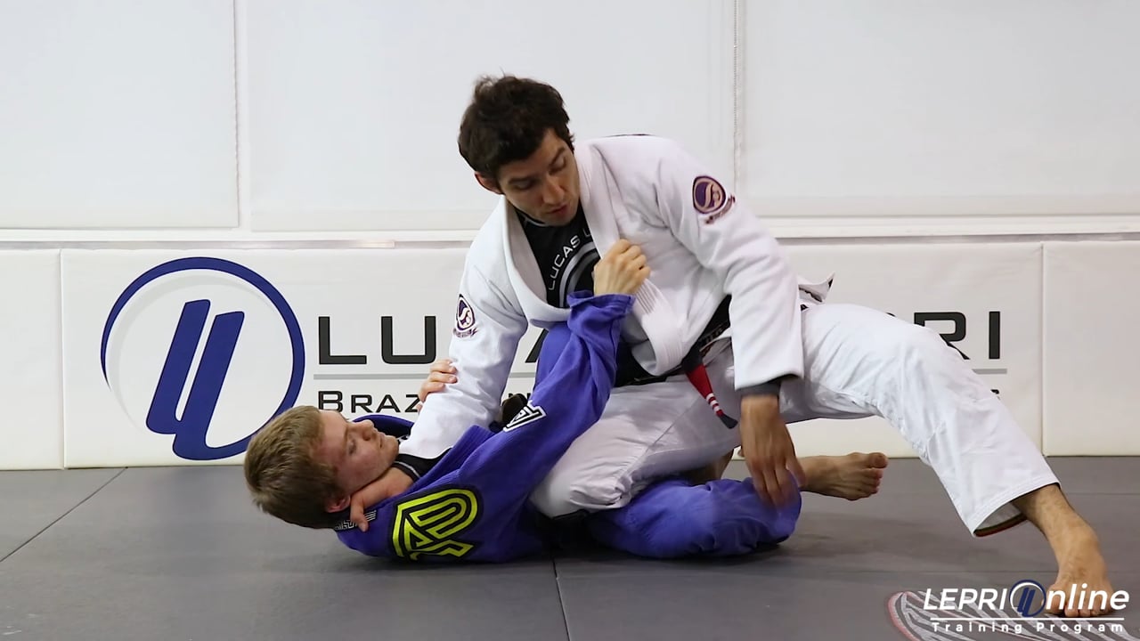 Professor Lucas Lepri shows an X-Guard sweep, starting from the De La Riva position. Lucas starts the De La Riva guard with one hand gripping the pants and the other gripping the same side collar. Lucas lifts his hips up and passes his De La Riva hook to the other leg, over the thigh. He then comes back down and traps the leg with the X-Guard. Lucas releases the grip on the leg and grips the same side sleeve. He then pushes the opponent back, completing the sweep. Lucas keeps both grips as he sweeps the opponent, slides his feet out and comes on top.
