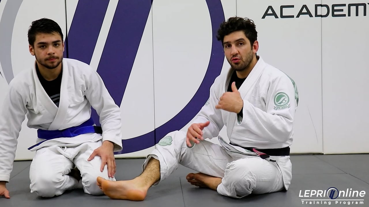 Professor Lucas Lepri teaches how to sweep the opponent when the opponent tries to escape from the de la riva. Lucas has the de la riva and is pushing and pulling the opponent to make them lose balance. The opponent reacts by stepping over the leg in an attempt to start escaping the de la riva. When the opponent steps over, Lucas immediately locks his legs together behind the opponent’s leg. He uses this to once again unbalance the opponent making him post on the mat. Lucas takes advantage of this and under hooks the near side leg. He also changes the grip on the pants by re-gripping under the foot instead of over. Lucas extends his leg to lift the opponent up so he can transition to the x guard. Lucas unbalances the opponent to make him post on the mat. He now sweeps the opponent using the overhead sweep. Immediately after the sweep, Lucas goes for the knee cut pass.