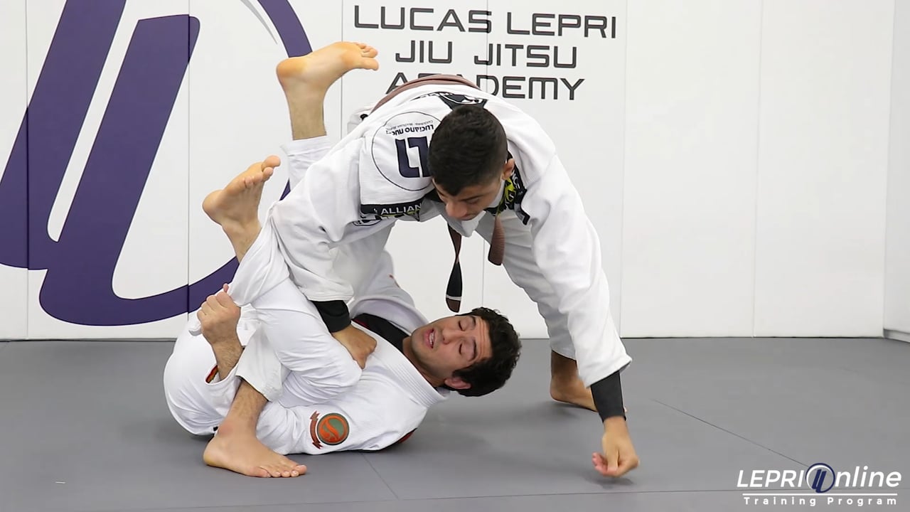 Professor Lucas Lepri shows how transition to the side control using the de la riva with the lapel control. Lucas has the De La Riva and begins to pull out the opponent's lapel so he can then grip the end and feed it to his other hand. He then grips the opponent's collar and uses his legs to push the opponent one way and when he reacts, Lucas pushes him to the other side. In this scenario, the opponent defends by stepping over Lucas’ head and sits on the mat. Lucas uses his legs in a pendulum motion to do a back roll over the opponent allowing him to get to the side control position.
