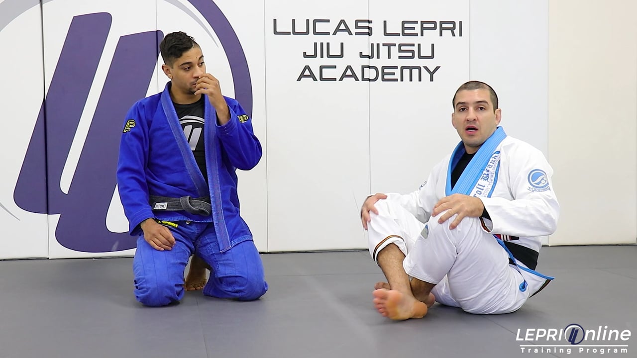 Professor Lucas Lepri teaches how to take the opponent’s back, after attempting to sweep the opponent. Lucas starts with the de la riva and controls the lapel so he can feed it to his other hand under the opponent’s leg. He now attempts to reach for the near side leg but the opponent defends by stepping back. Lucas reaches for the other leg and pendulums so he can switch the lapel control to his other hand. He now pendulums in an attempt to sweep the opponent, but in this scenario the opponent defends by placing his knee on the mat. Lucas now slides his arm under the opponent’s and grips the back of the pants. He pulls the pants and pushes with his near side leg. Lucas now reaches over the back to get the seat belt grips and finishes taking the back.