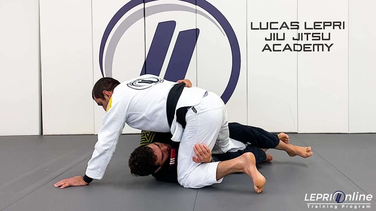Professor Lucas Lepri teaches how to prevent the opponent from reaching the deep half guard. Lucas is in the opponent’s half guard and is getting ready to pass. The opponent attempts to go for the deep half guard but Lucas defends. Lucas moves his top leg up and slightly turns his hips as he raises and points out his other knee. He uses his top hand to block the opponent on the pants or on the hip. He now under hooks the opponent and changes his base with his legs. From here, Lucas now cross faces the opponent and passes to the side control.
