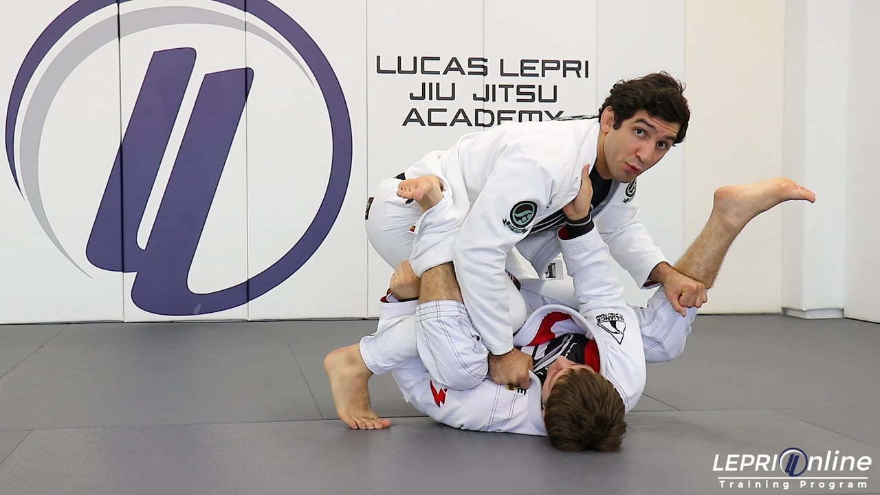 Professor Lucas Lepri teaches a variation on how to defend when the opponent has the lapel control. The opponent jumps guard and under hooks Lucas’s leg. He immediately feeds Lucas’ lapel to the under hooked hand. Lucas starts to defend by gripping the opponent’s collar and pants and then applies pressure. In this scenario, the opponent swings his leg out. Lucas switches the grip on the leg and also grips the other leg. He now steps back and pushes down on both legs. He places his head near the opponent’s hips so the opponent won’t try to recompose. From here, he works on passing.