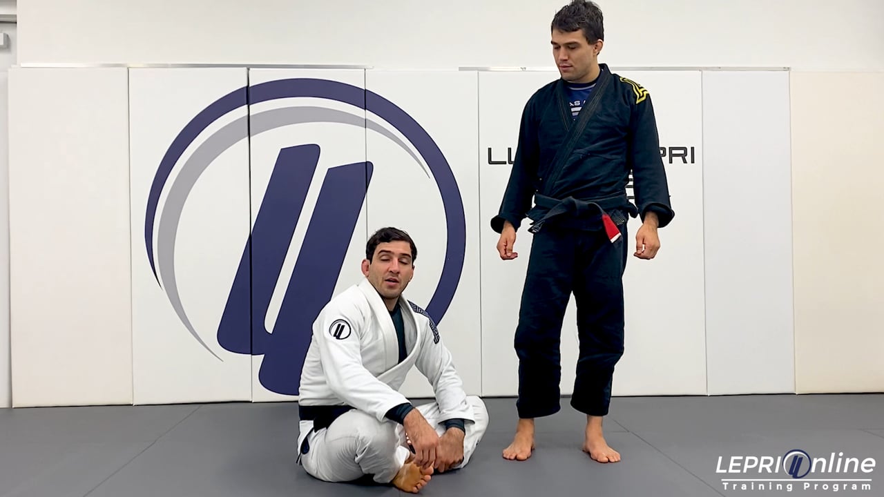Professor Lucas Lepri teaches how to sweep the opponent and come up, using the double ankle grab sweep. Lucas is playing guard, controlling the sleeves and his feet on the hips. The opponent starts to walk forward and Lucas switches the grips from the sleeves to the ankles. He pushes the opponent with his legs as he traps both ankles to sweep the opponent back. Lucas now prevents the opponent from coming back up by hooking his feet under the opponent’s legs. The legs are now used to push the opponent away and then Lucas is able to come up while still controlling the ankles.