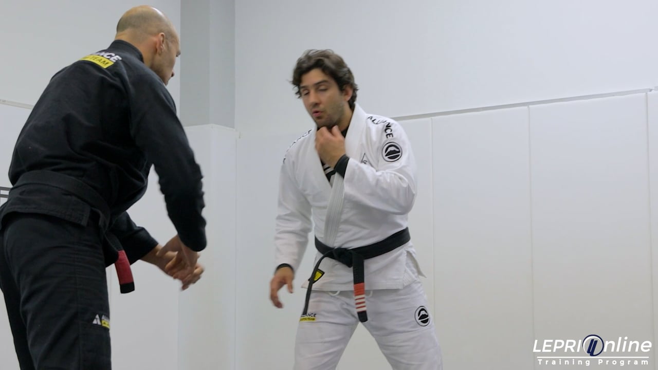 Professor Lucas Lepri shows how to transition to the clock choke, after defending a double leg. The opponent shoots for a double leg and Lucas immediately counters by sprawling. Lucas explains a little detail about when to use his feet to push, or when to bend his foot to slide on the mat making it harder for the opponent to defend the sprawl. After successfully defending the double leg, Lucas slides to the side of the opponent. He reaches for the collars and shows how to get the clock choke submission.