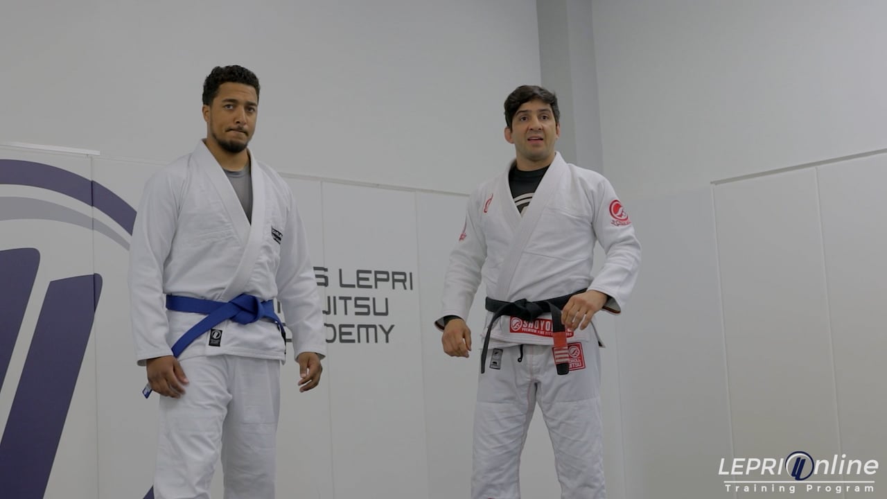 Professor Lucas Lepri teaches how to defend from a double leg takedown and shows how to get to the back control. The opponent goes for a double leg and Lucas immediately counters by sprawling over the opponent. One arm goes in front of the shoulder and the other over the torso to control the waist. As soon as the opponent’s hands release Lucas’ knees, Lucas moves to the side in the opposite direction the opponent’s head is facing. He immediately connects his hands together using the seat belt grip. One hand over the shoulder and the other under the arm. Lucas now drops his shoulder making the opponent fall to the side where he immediately establishes the back control by establishing his hooks while maintaining the seat belt grip.