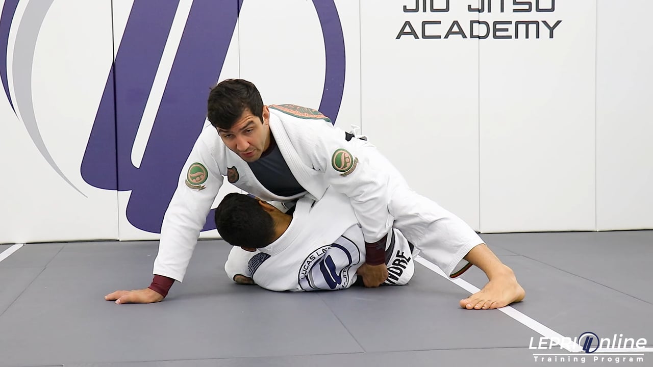 Professor Lucas Lepri teaches how to sweep the opponent after defending from the double under. The opponent has the double under and Lucas immediately grips the back on both sides to prevent the opponent from posturing up. When the time is right, Lucas now reaches for the belt. He uses the same side leg to post on the mat so he can turn enough to post his outside elbow on the mat. The bottom leg is now used to trap the opponent’s leg as Lucas lifts his hips up to sweep the opponent. From here, Lucas maintains the grips and when the opponent settles down, he transitions to the mount position.