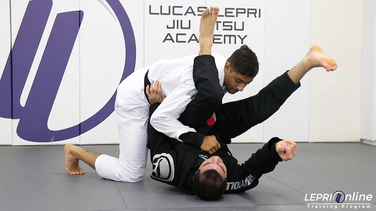 Professor Lucas Lepri teaches how to escape from the double under and go for a single leg, when the opponent is able to get a cross collar grip. The opponent has the double under on Lucas and is able to reach over the leg to get a cross collar grip. He now starts to lift Lucas’ hips off the ground. Lucas immediately pendulums his legs and rolls over his shoulder. From here, Lucas can go for a single leg or recover the guard.