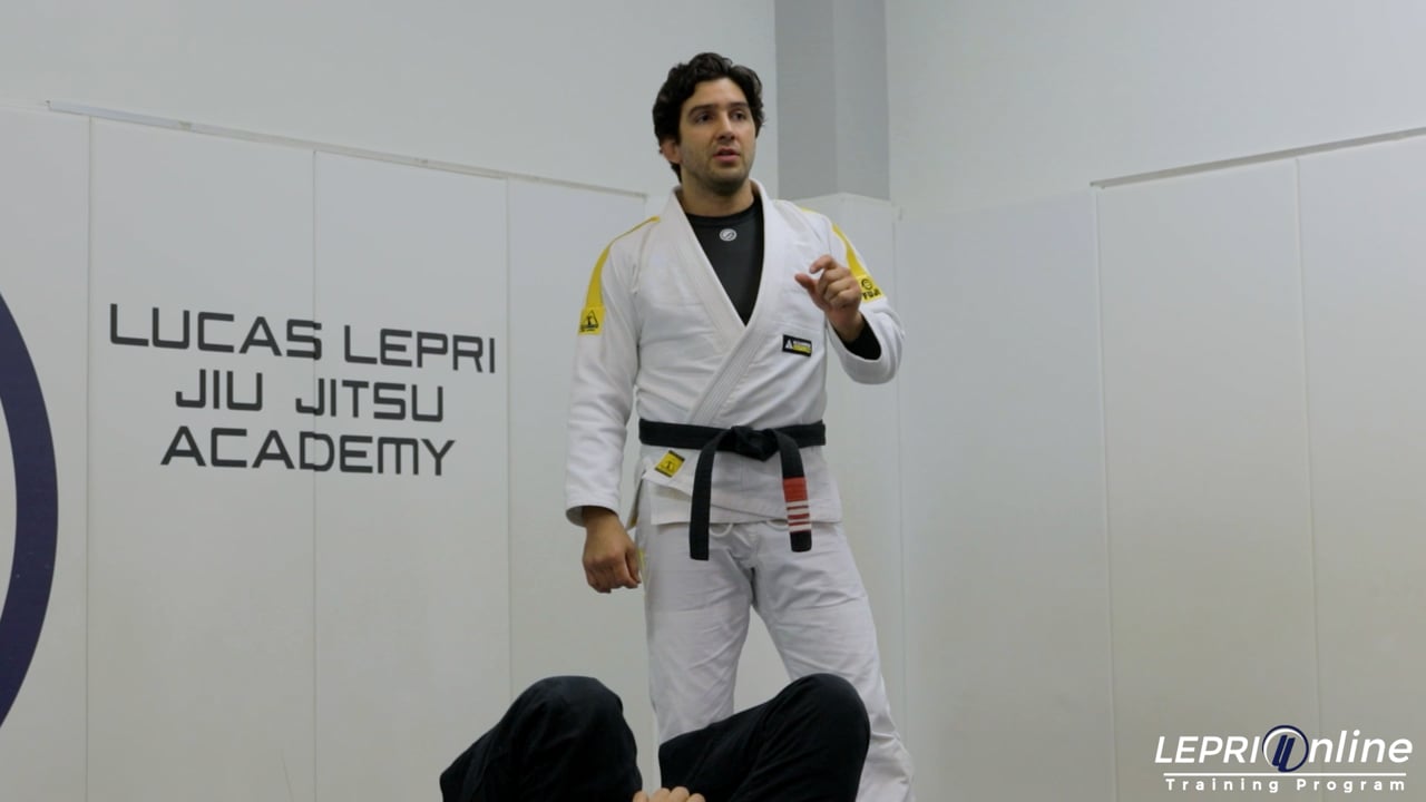 Professor Lucas Lepri teaches how to pass the opponent’s guard using a double under. Lucas goes for the double under and starts to pass by controlling the cross collar and near side pants. He applies pressure as he lifts the opponent up by the pants. The opponent blocks Lucas’ attempts to pass. Lucas counters the defense by continuing to lift the opponent up by the pants, and uses his knee behind the back to push the opponent over. He maintains the grip on the collar. Lucas then switches grips and goes for the seat belt grip where he can then transition to taking the back.