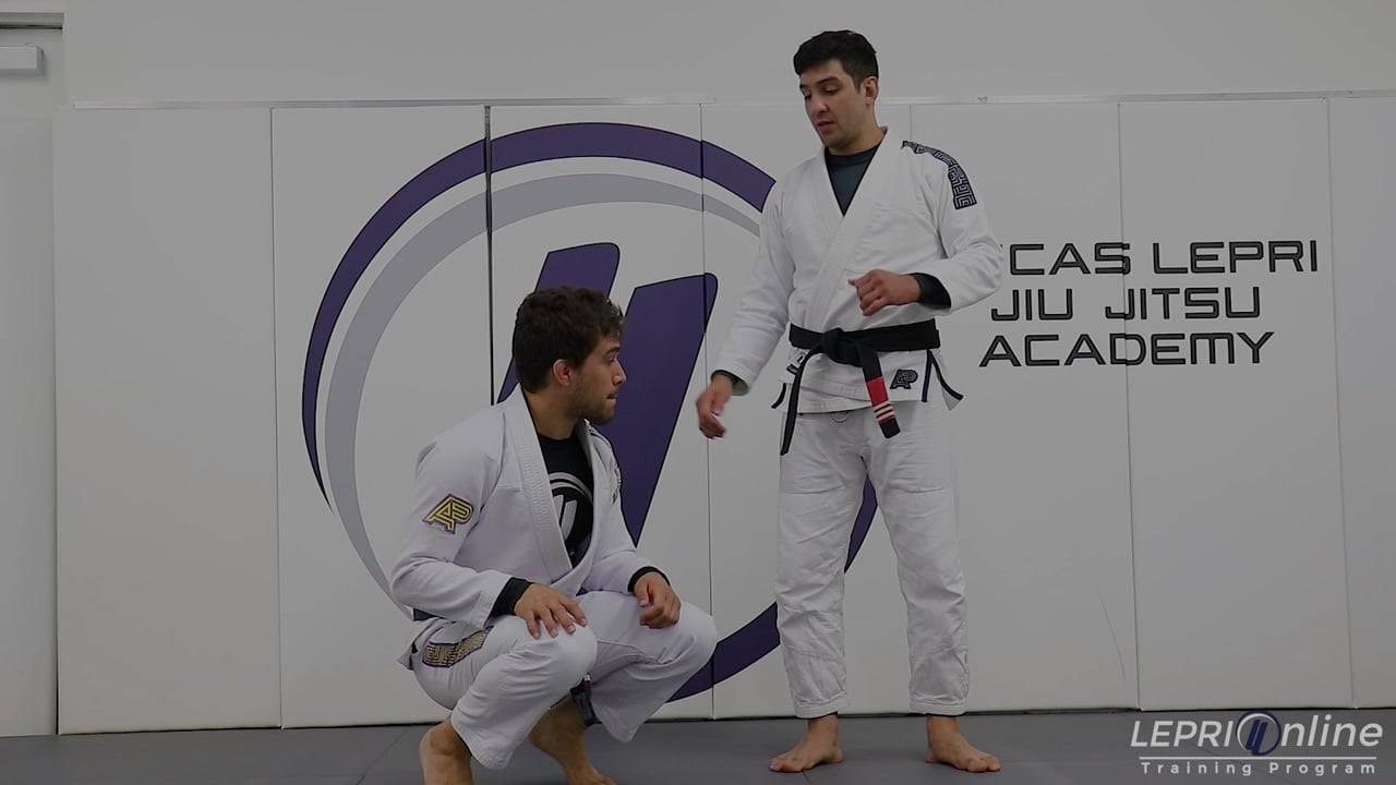 Professor Lucas Lepri teaches how to get the clock choke after he attempts to pass and the opponent tries to go for the single leg. Lucas is passing and the opponent starts to turn in and reaches for the single leg. Lucas immediately reaches under the neck to grip the opposite side collar. In this scenario, Lucas is not able to reach for the other collar or arm with his other hand. He instead, places his other elbow next to the neck and starts to walk to the side to finish the clock choke.