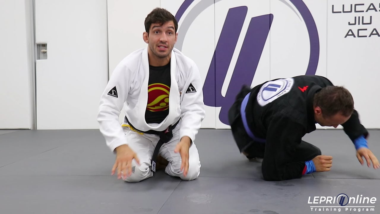 Professor Lucas Lepri shows how to sweep the opponent by using his legs to lift him up and roll him over to the mount position. Lucas starts with both of his legs on the opponent’s hips. As the opponent walks side to side, Lucas follows. Once the opponent reaches for the collar grips, Lucas grips the sleeves and places his feet on the hips. He pulls the opponent in and he raises him with his legs. Lucas rolls over his own shoulder to roll the opponent back landing on the mount position.