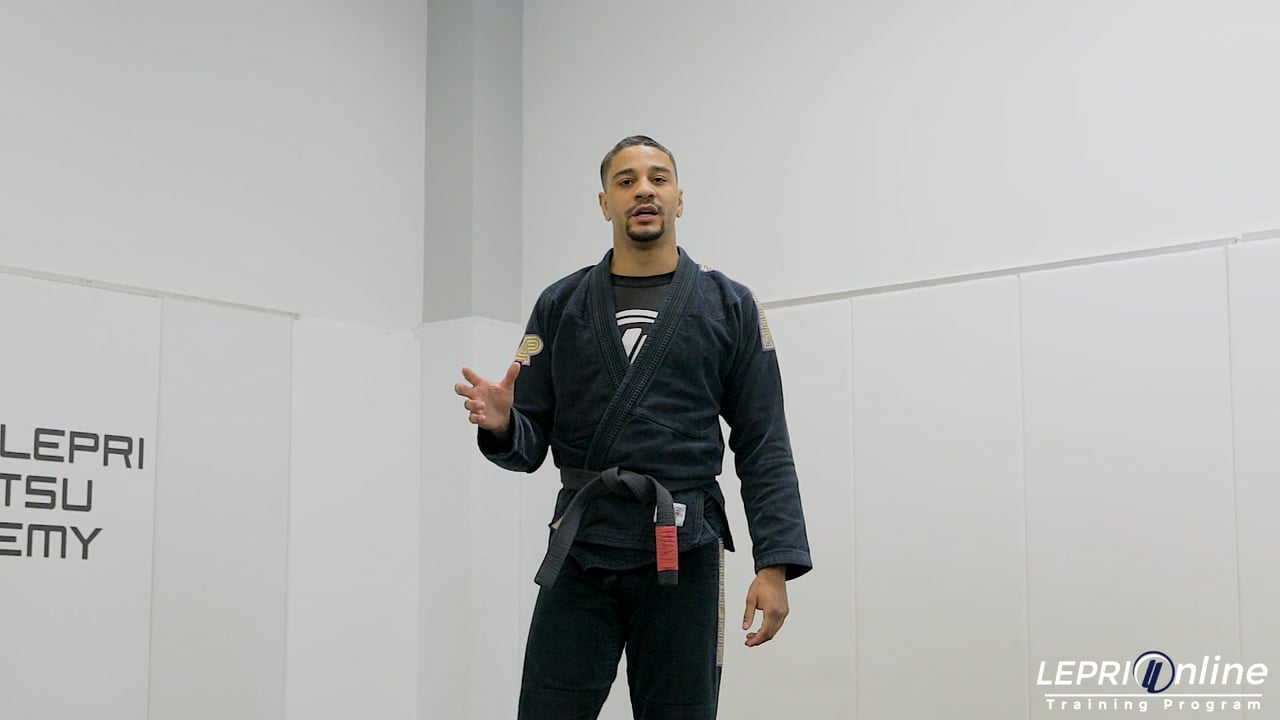 Professor André Gois teaches how to counter a guard pull by going to the side control. André and the opponent are both standing with judo grips, one hand on the collar and the other on the sleeve. The opponent starts to go for a guard pull but on the side he is controlling the collar. As soon as Andrénotices, he moves his hips back, grips the foot that the opponent pulls guard on and pushes it to the side. André maintains the grip on the collar and as soon as he pushes the leg to the side, he moves in to the side control position.
