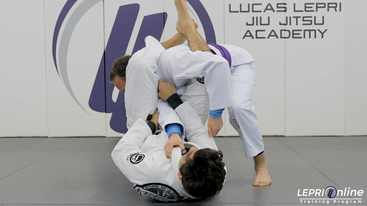 Professor Lucas Lepri teaches how to pull guard and get the armbar. Lucas is controlling the collar in the sleeve. He places his foot on the opposite side hip of the controlling arm. He falls to the ground while maintaining the foot on the hip and spins on his back as he pulls the arm down. This momentum allows Lucas to bring his outside foot over the head to get the armbar submission.
