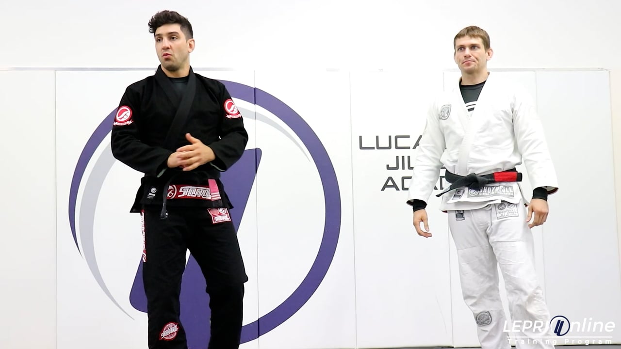 Professor Lucas Lepri teaches how to do the helicopter armbar, after pulling guard. Lucas and the opponent start standing. Lucas controls the collar and sleeve near the elbow. He steps to the side and pulls guard. In this scenario, Lucas keeps his feet on the opponent’s hip. He now raises the opponent up with his legs. Lucas now removes one foot from the hip, making the opponent fall to that side. From here, Lucas immediately locks in the armbar.