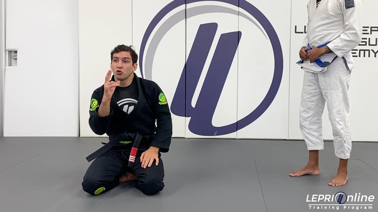 Professor Lucas Lepri teaches how to get the triangle after pulling guard with the foot on the hip. Lucas and the opponent are standing up and Lucas goes for the sleeve and same side collar grips. He starts to pull the opponent and places his same side foot as the grips, on the hip. He pulls guard and immediately brings his other leg over the opponent’s shoulder. Lucas locks the triangle. If the opponent defends, Lucas can then stretch the arm and gets the armbar instead. If the opponent stacks Lucas, he can then under hooks the near side leg and turns the opponent to the side. From here, he can finish the triangle or also get the armbar.