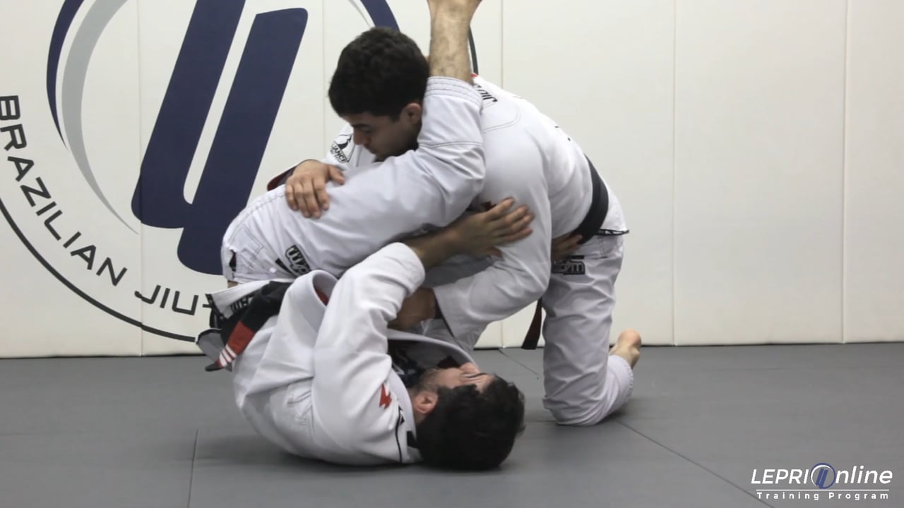 Professor Lucas Lepri shows how to recover guard or apply a triangle choke when the opponent moves from side control to north-south position to prevent Lucas' guard recovery. In this situation, Lucas keeps his elbows tight, bridges, and pushes in order to enter his knee and trap around the opponent's head with his other leg. He can then push the opponent away, spin, and establish grips to recover the open guard. Alternatively, Lucas can attack with the triangle by pulling with both hands on the same arm while pushing the opponent's hip with his foot and then locking his legs. To finish the attack, Lucas crosses the opponent's arm and immediately controls his posture until he is able to lock the triangle and apply the choke.