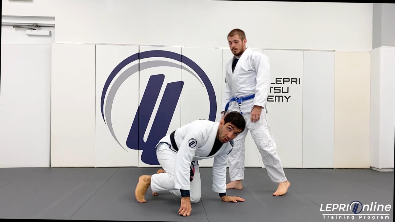 Professor Lucas Lepri teaches how to recover the guard when the opponent attempts to pass with the toreada pass. The opponent starts to pass and Lucas immediately blocks the shoulder and arm. He uses the momentum of the opponent’s grip on the far side leg to invert himself. Lucas now uses any grip available to pull himself back and face the opponent to recompose the guard.