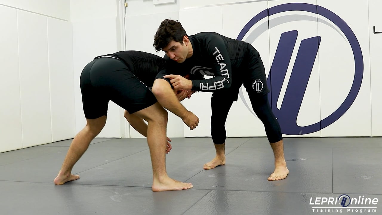 Professor Lucas Lepri teaches how to take the opponent down with an ankle pick, after attempting a guillotine. Lucas grips the back of the opponent's neck and pulls it down. He immediately brings his other arm over the back of the head and cups the chin. He makes sure to maintain shoulder pressure behind the head. Lucas attempts to connect his hands together to start working a guillotine, but the opponent defends by gripping Lucas’ hand. Lucas keeps the chin cupped and then drops down to his knee reaching the ankle with his other hand. He pulls on the ankle and pushes the opponent back using his shoulder and arm to take the opponent down. From here, Lucas can now work on passing.