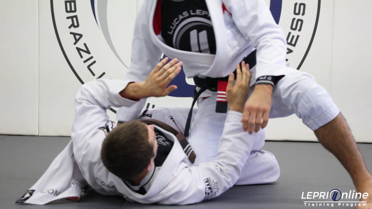Professor Lucas Lepri teaches a submission that can be applied when you are going for an open guard pass and your opponent traps you in half guard. As Lucas goes for the pass, his opponent traps him in half guard. As soon as this happens, Lucas controls the head and arm while at the same time keeps the pressure on him and looks away to avoid the the opponent’s frame. He also keeps his untrapped knee close to his opponents hips to prevent his opponent from recomposing the guard. Lucas then uses his right hand to pull out the opponents lapel and feeds it under the arm, to his other hand under the back of the opponent's head. At this point, Lucas must take his trapped knee out by turning his hips to point his knee up and then sliding his knee in, like a knee cut pass. He then loops his right arm over the opponent's arm and under his chin to switch the lapel grips from his left hand to his right hand. He then slides his left hand up the same lapel so he can then bring his elbow over the opponent’s neck finishing with the cross choke submission.