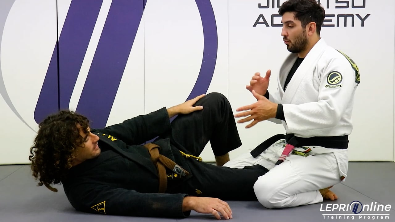 Professor Lucas Lepri teaches how to escape from the opponent’s half guard and get a lapel choke. Lucas starts in the opponent’s half guard. He immediately under hooks the opponent’s far side arm before they are able to also under hook. Lucas now controls the head with his other arm and applies pressure to keep the opponent flat on the mat. He now takes the opponent’s lapel out and feeds it to the hand behind the head. In this variation, Lucas is not able to under hook the opponent’s arm, because the opponent under hooks Lucas first. Lucas replaces the grip on the collar with his other hand. He now reaches over the head to grip the same lapel with his previous hand. He now bends his elbow in and applies pressure to get the lapel choke.